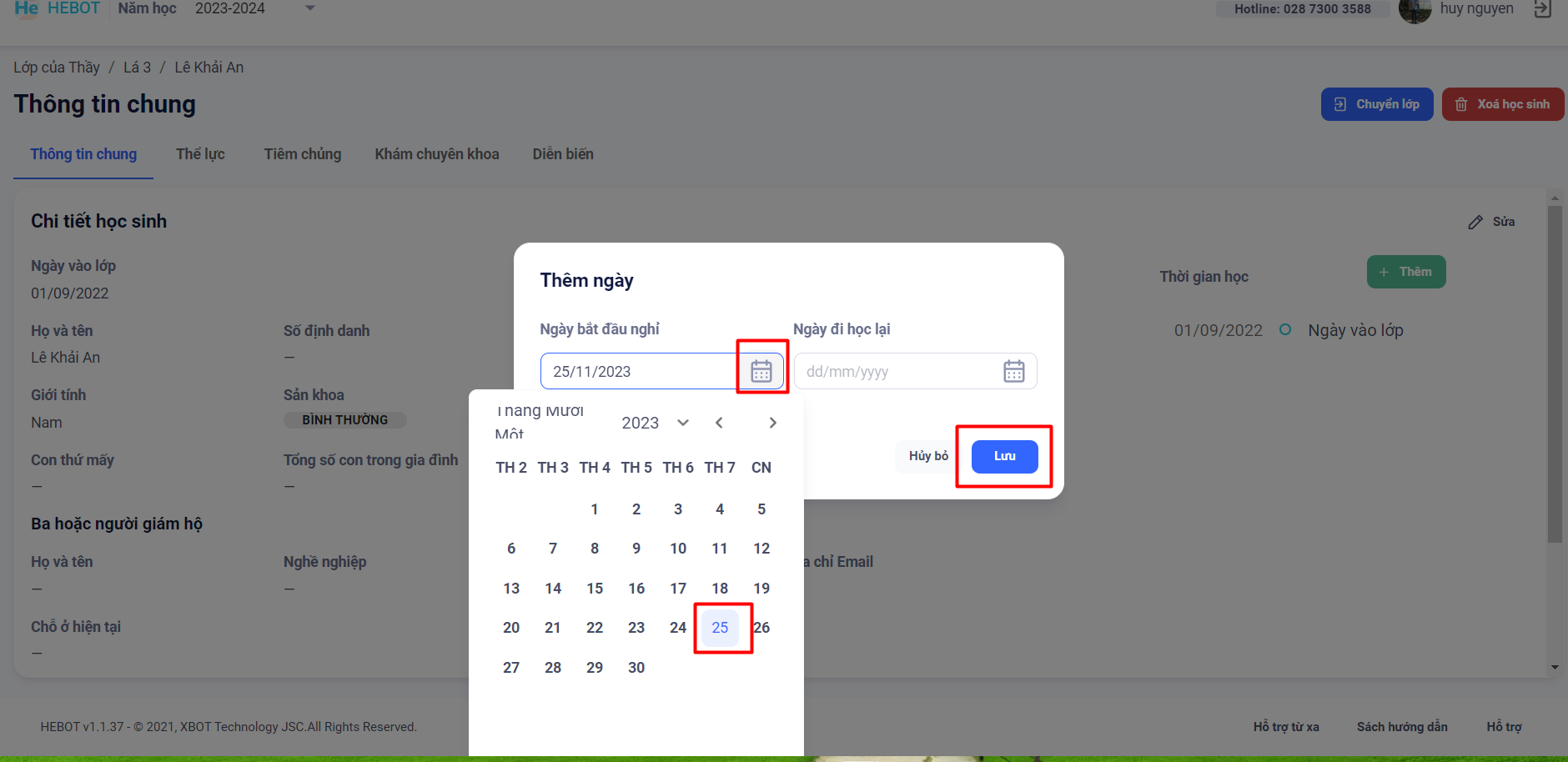 Bước 3: Chọn ngày bắt đầu nghỉ cho học sinh sau đó bấm nút Lưu